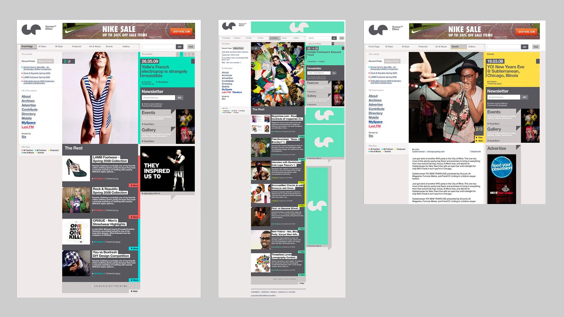 More than a dozen staff writers contributed to the site, as well as outside contractors such as Six, a UK branding and identity firm which produced an award winning rebrand in 2008, landing Grooveeffect in numerous design showcases and galleries. Beyond staff, I managed relationships with dozens of brands, publicists, PR agencies, musicians, and promoters.